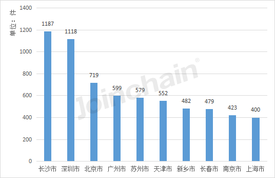 从各城市首次注册总量排名看,长沙市1187件位居全国第一;深圳市、北京市分别以1118件与719件排名第二与第三。